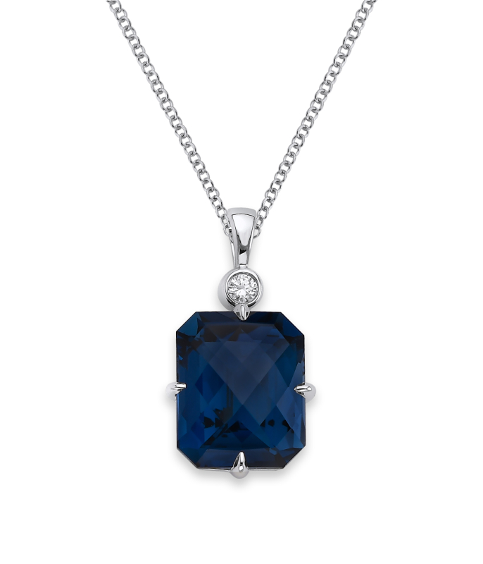 Pendant set with 0.03 carat round diamond and 5.35 carat London Blue Topaz in 14k white.