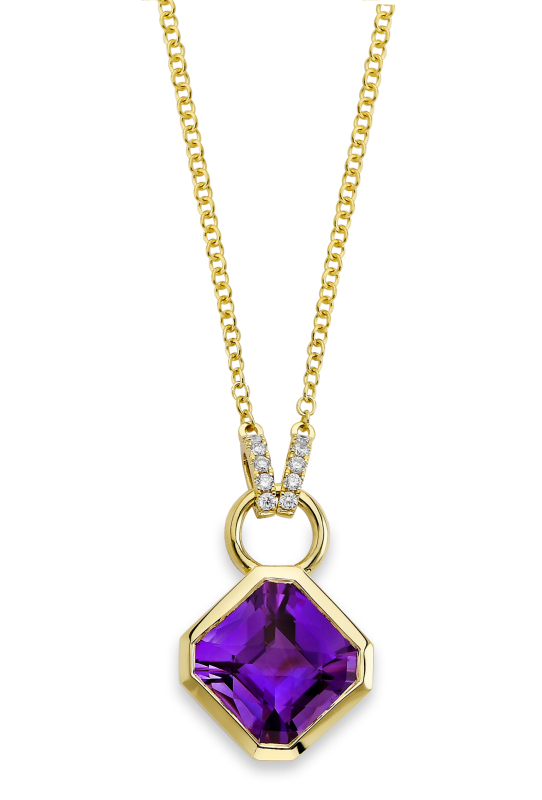 Pendant set with 0.07 carats T.W. round diamonds and 3.00 carat Amethyst in 14k Yellow Gold.