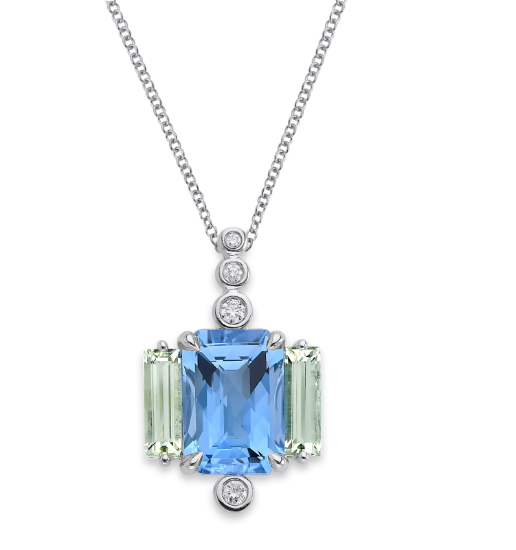 Pendant set with 0.06 carats T.W. round diamonds, 0.73 carats T.W. Prasiolite and 3.40 carat Blue Topaz in 14k White gold.