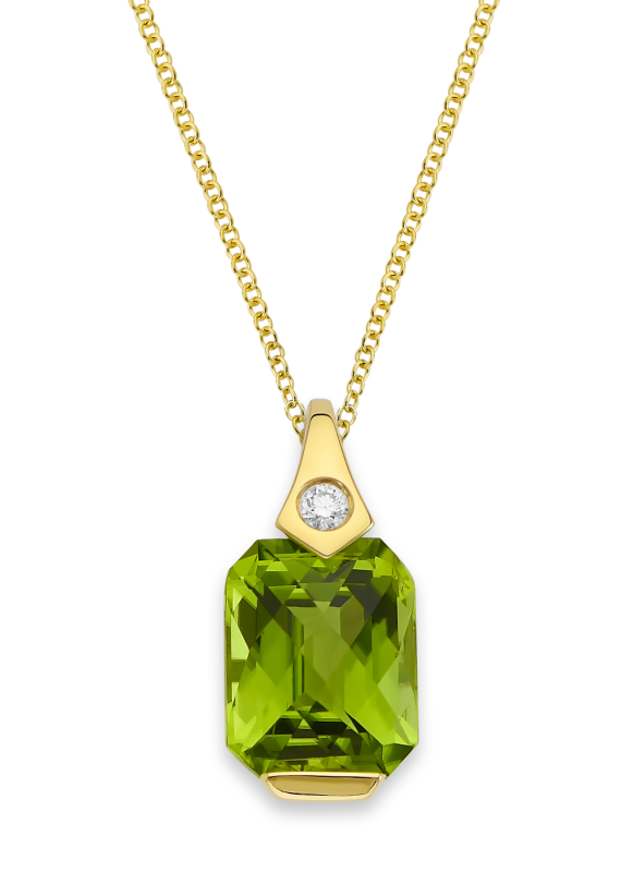Pendant set with 0.03 carat round diamond , 3.85 carat Peridot in 14k Yellow gold.
