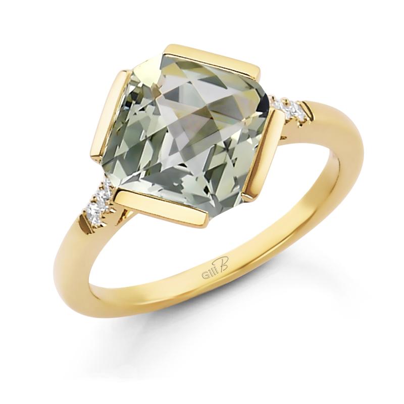 Ring set with 0.10 carats T.W. round diamonds and 3.58 carat Prasiolite in 14k Yellow gold.