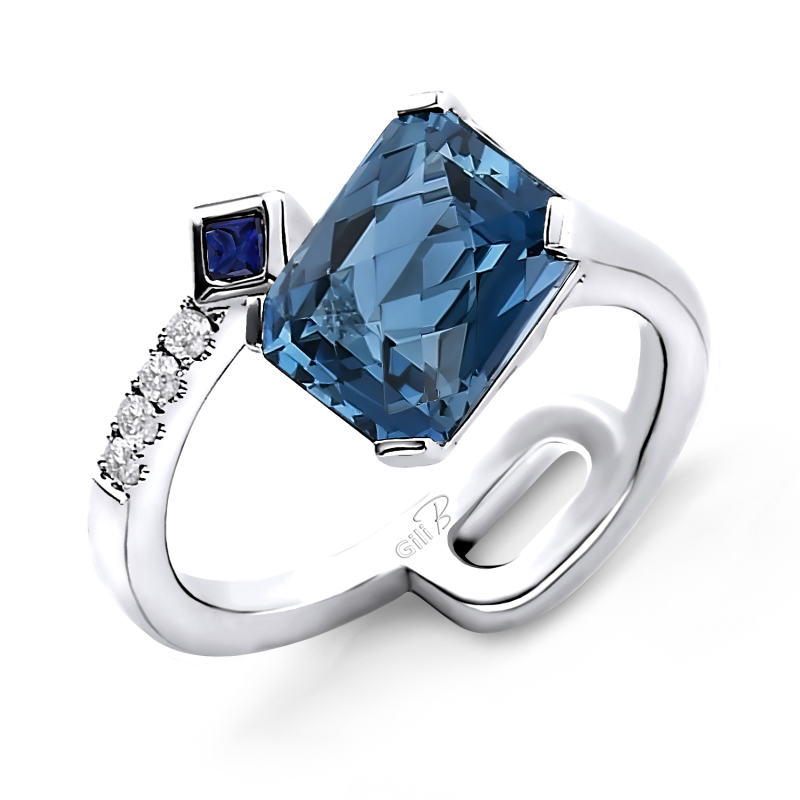 Ring set with 0.08 carats T.W. round diamonds, 4.63 carat London Blue Topaz and 0.10 carat Sapphire in 14k white gold.